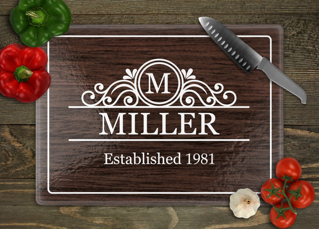 Dress up your kitchen countertop with a personalized glass cutting board that doubles as a serving board for fruit, cheese, and more! Our custom personalized glass cutting boards are a wonderful addition to any kitchen's decor or as a serving centerpiece. Give one to your child's favorite teacher, as a housewarming gift for a friend, a wedding gift or get one for yourself!